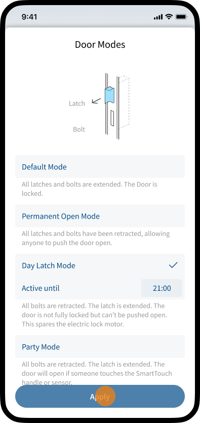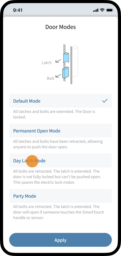4. Tap Apply to activate the door mode.