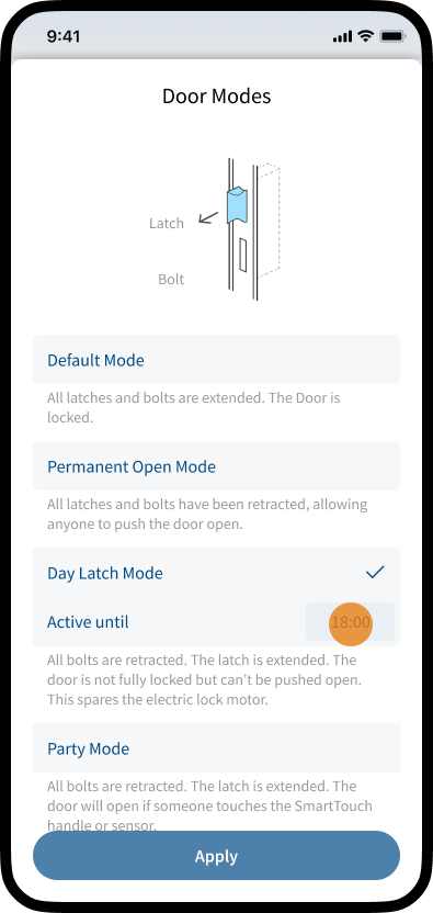 When the Party Mode is activated, only the latch secures the door (same as Day Latch Mode). By touching the SmartTouch handle or the SmartTouch sensor, the latch is retracted and the door can be pushed open without access control.