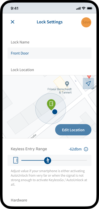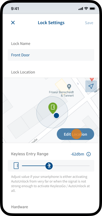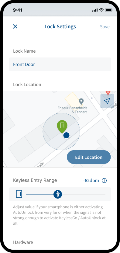 The SmartAccess Module automatically determines the location of your lock. The position of the lock and the position of your smartphone should be the same. Please check that the position has been set correctly.