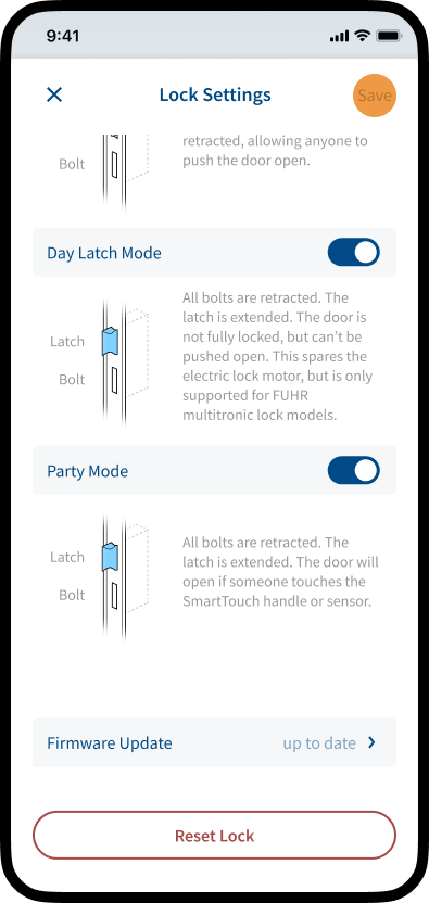 SmartAccess offers the option of using various door modes (Day Latch Mode, Permanent Open Mode, Party Mode).