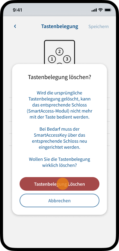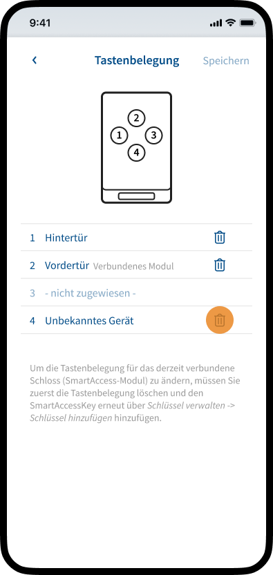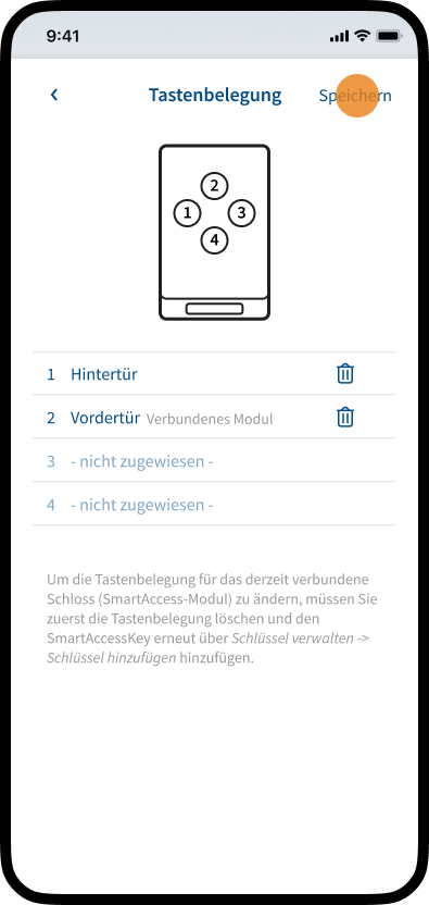 Hinweis: Wenn Sie die Tastenbelegung für ein SmartAccess-Modul löschen, das aktuell nicht verbunden ist, kann das entsprechende SmartAccess-Modul nicht mehr mit der Taste bedient werden.