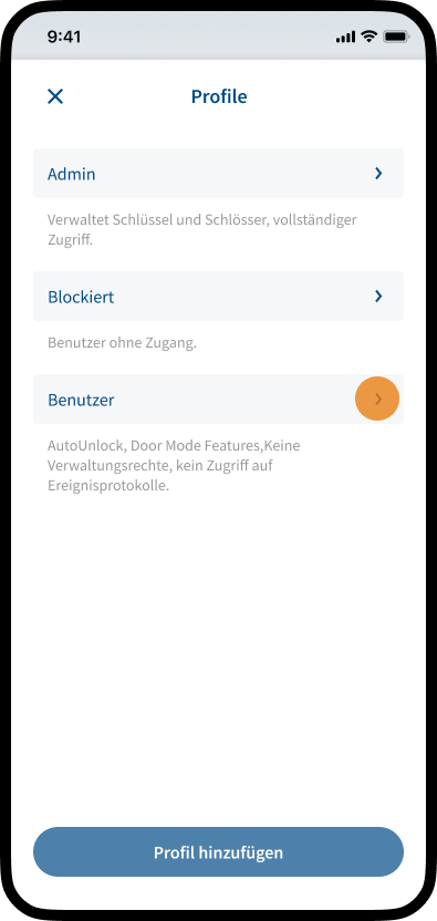 Um einem Profil einen zeitlich beschränkte Zutrittsberechtigung hinzuzufügen, tippen Sie auf das entsprechende Profil.