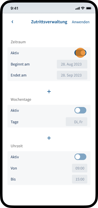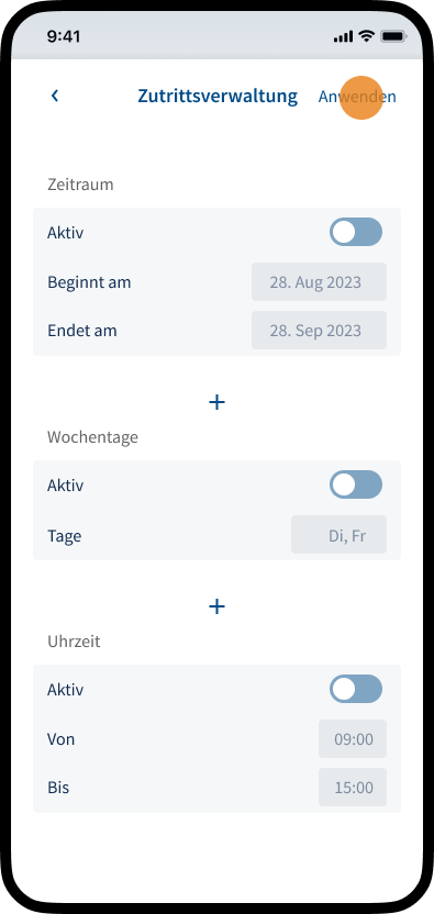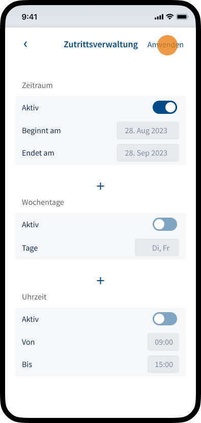 Tippen Sie auf Anwenden, um die zeitlich beschränkte Zutrittsberechtigung zu speichern.