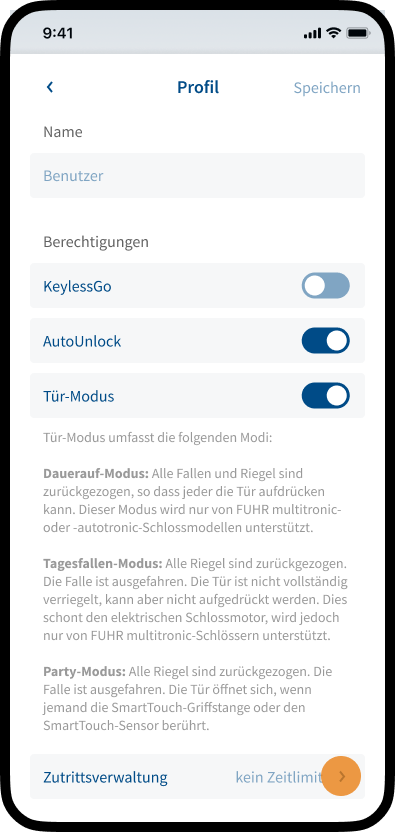 - Tippen Sie auf Zutrittsverwaltung, um die Einstellungen der zeitlich beschränkte Zutrittsberechtigung anzupassen.